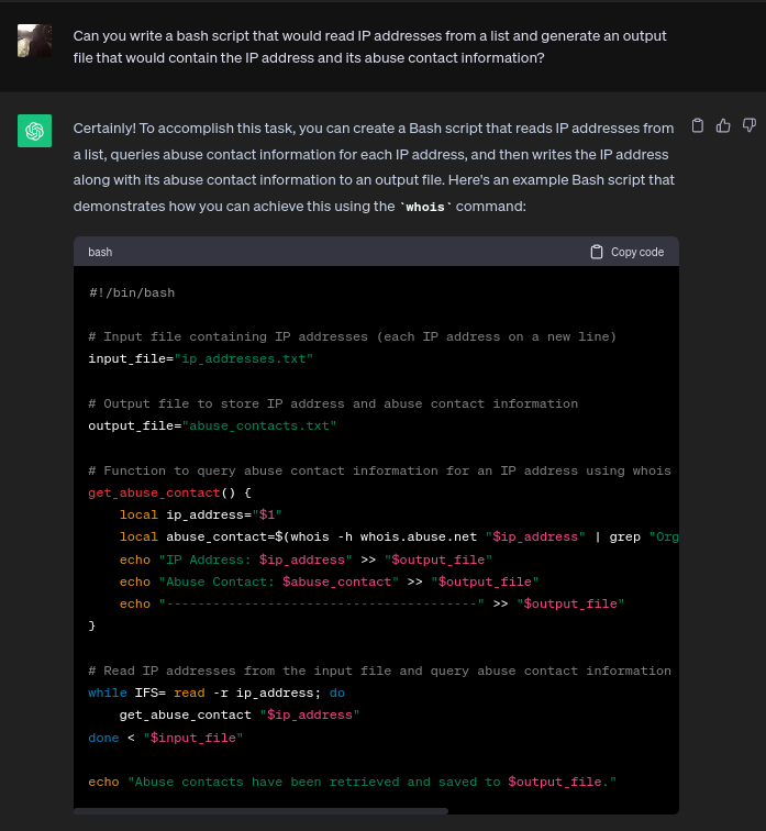 I was very amazed to say the least, my mind was blown. Chat GPT came up with a Bash script in less than a few seconds.