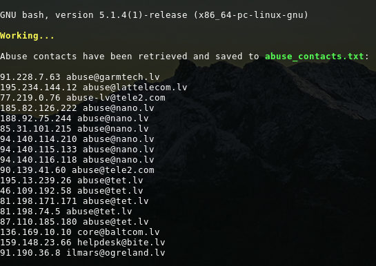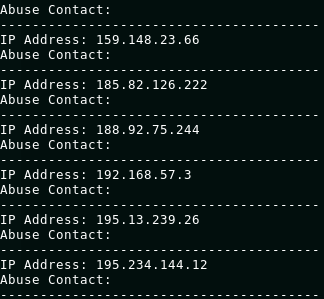 Recently I was tasked with writting a Bash script that would querry IP addresses from a file and return their corresponding abuse contact e-mail addresses.