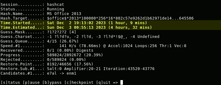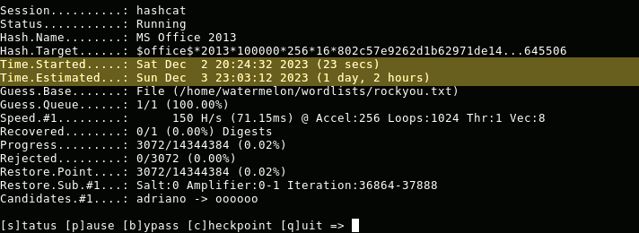 It would take 1 day and 2 hours for Hashcat to throw all the passwords present in the aforementioned wordlist at the hash of the Word document.