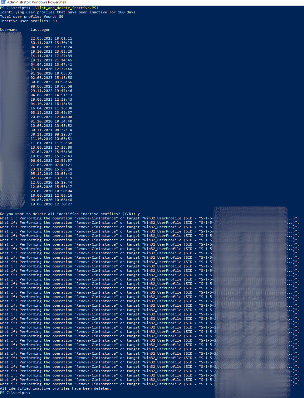 Skripts parāda visu lietotāju profilus, kas konkrētajā iekārtā nav pierakstījušies vismaz 180 dienas un piedāvā tos dzēst